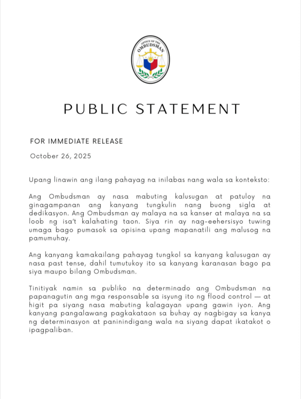 Nilinaw ng Office of the Ombudsman nitong Oktubre 26, 2025 na si Ombudsman Jesus Crispin “Boying” Remulla ay nasa maayos na kalusugan at patuloy na ginagampanan ang kanyang tungkulin nang buong sigla at dedikasyon, matapos kumalat ang ilang pahayag na umano’y labas sa konteksto.